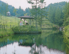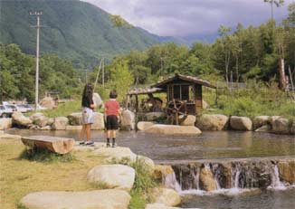 水車の回る公園内は、テニスコート、マレットゴルフ場、ジャンボ滑り台などが整い、清流での魚つかみ取りが楽しめます。 |