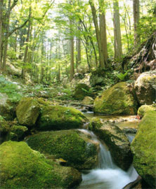 推定樹齢200年以上の天然林で、中でも樹齢550歳・直径2.5m(胸高周囲6.7m)の天然サワラは圧巻、その大木を見上げていると古の森の声が聞こえてくるようです。 |