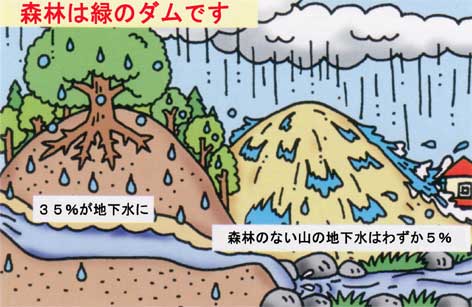 木のたくさんある森林は、落ち葉や草やコケなどがあって、雨が土の中にしみこみやすく、降った雨の35%を地下水として蓄えて、少しずつ川へ流す力があるので「緑のダム」とも言われています。 森林のない山は5%くらいしか地下水になりません。 |