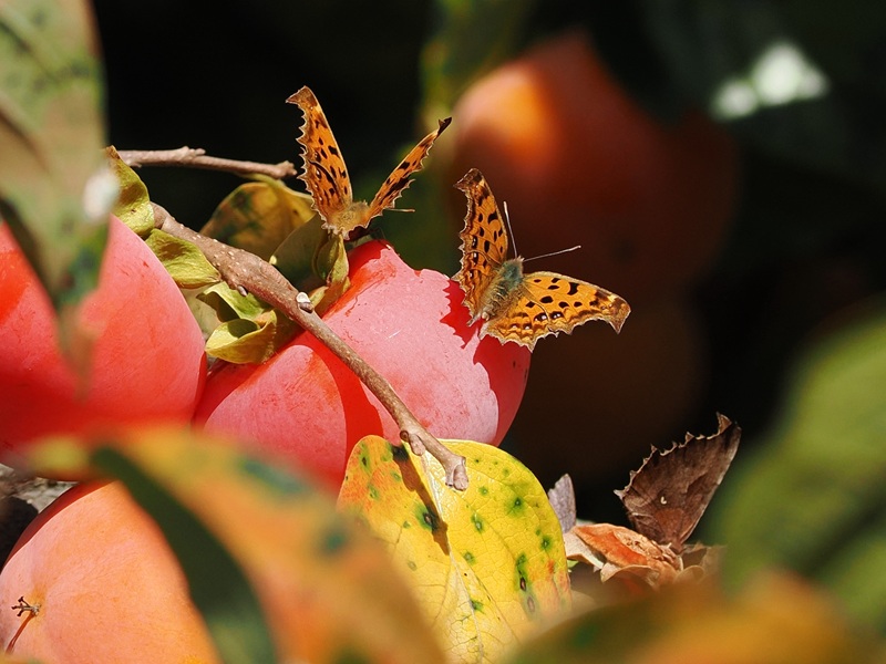 柿で吸汁するキタテハです、近くに食草が有るのでキタテハが多いです 熟した柿の美味さは格別でミツバチ、キイロスズメバチ、蠅、蛾などが 吸汁に訪れて喧嘩をしたり賑やかです。 (今後2カ月程柿と蝶を掲載します)