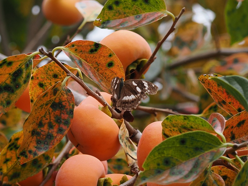 この蝶の吸汁場面は確認していません、柿の木へたまたま立ち寄っただけでしょうか。 先月ツマグロヒョウモンの吸汁