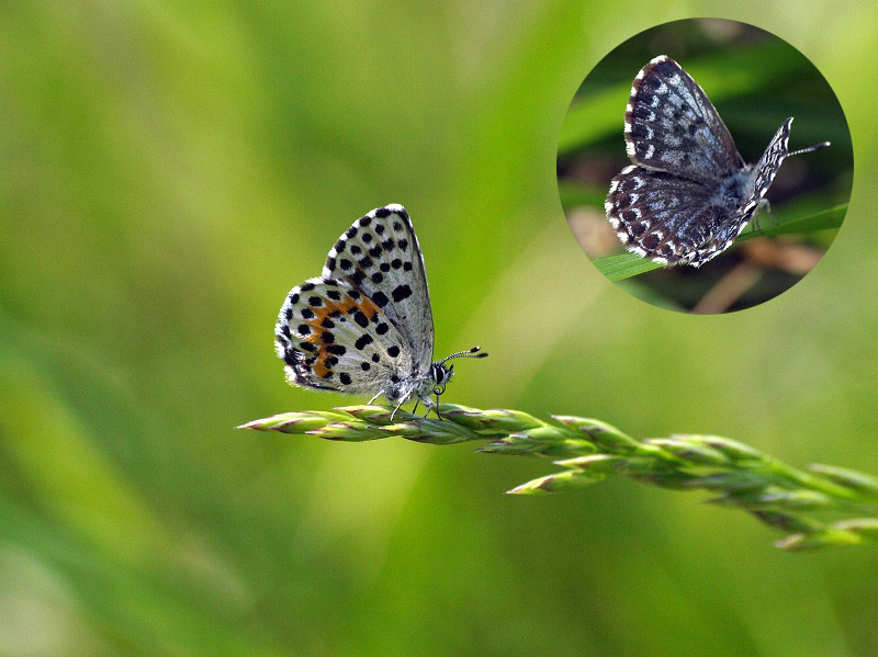 今月はちょっと変則で、以下の蝶のリクエストをいただきました。 ジョウザンシジミ、アイノミドリ、クロツバメシジミ、ルリウラナミシジミです 先ずはジョウザンシジミ、円内が開翅の様子です(春型♀)