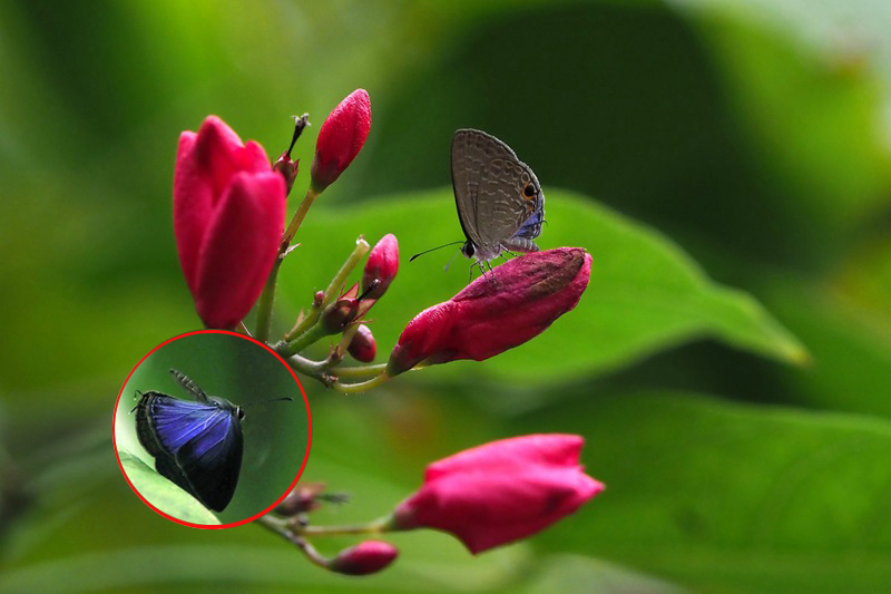 沖縄で撮影したルリウラナミシジミです、開翅してくれない種ですので 円内は飛翔中を撮影したものです。